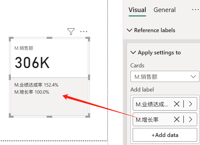 一个卡片展示多个指标有助于辅助对业务状况好坏做出判断,比如主体展示销售业绩,辅助展示目标达成、业绩增长。Power BI卡片图视觉对象可以添加引用标签实现一卡多指标,但是布局不灵活且条件格式设置有限。