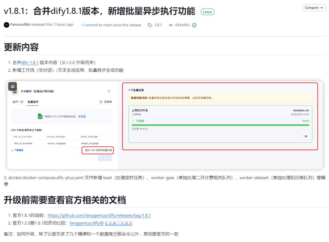 dify-plus 1.8.1 在功能、性能与可维护性方面都有明显提升,特别是批量异步执行和新的 Docker 任务处理架构,将为用户在大规模文本生成和知识库管理场景中提供更高效的支持。同时,多个 bug 修复与体验优化,使系统运行更加稳定可靠。