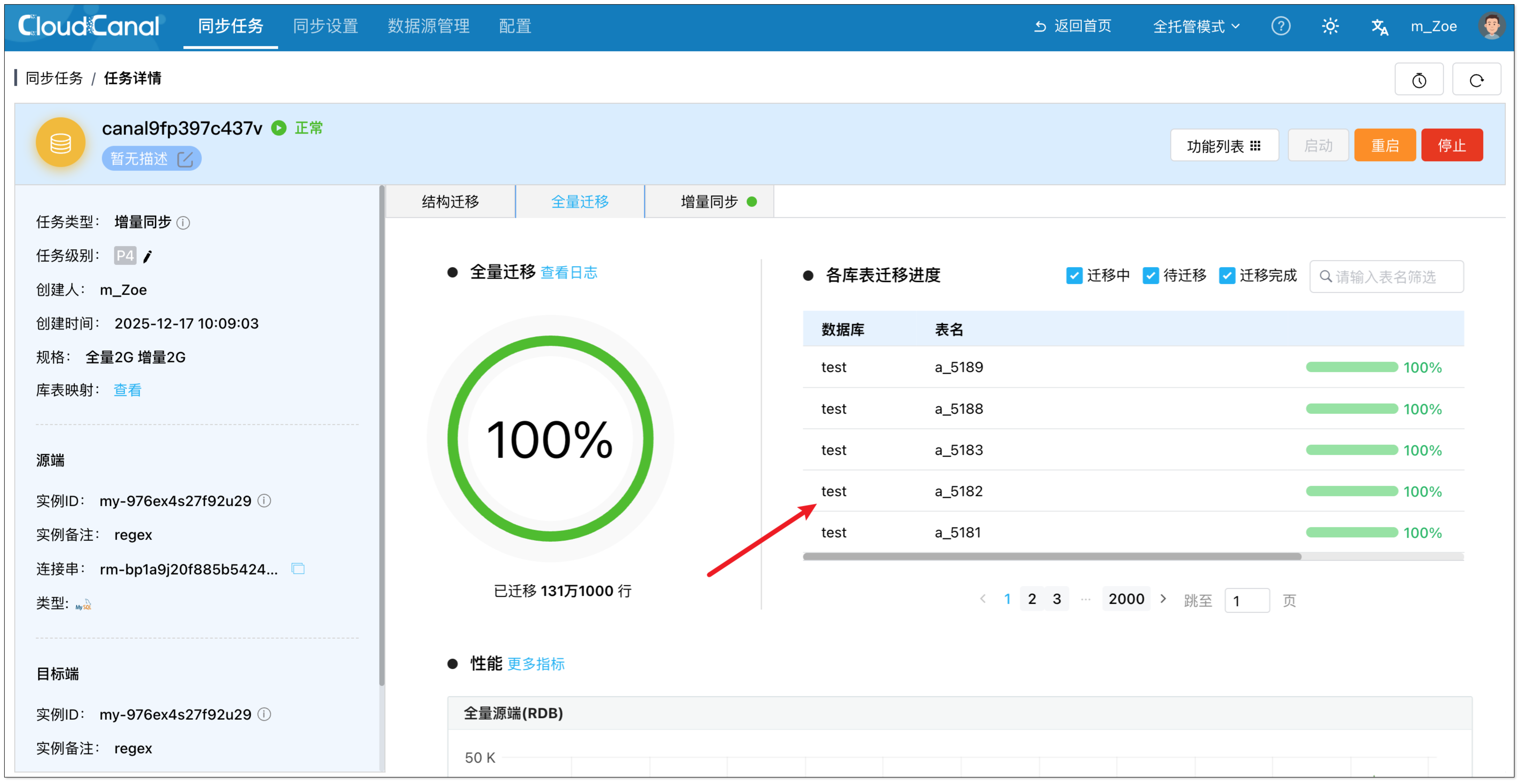 在任务详情页,可以查看迁移同步的表。