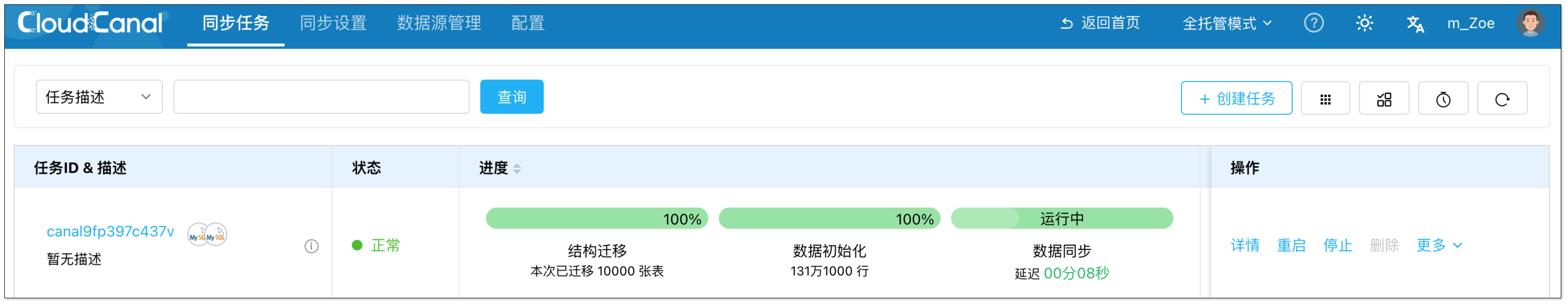 任务启动后,CloudCanal 会自动进行结构迁移、全量迁移、增量同步的任务流转。