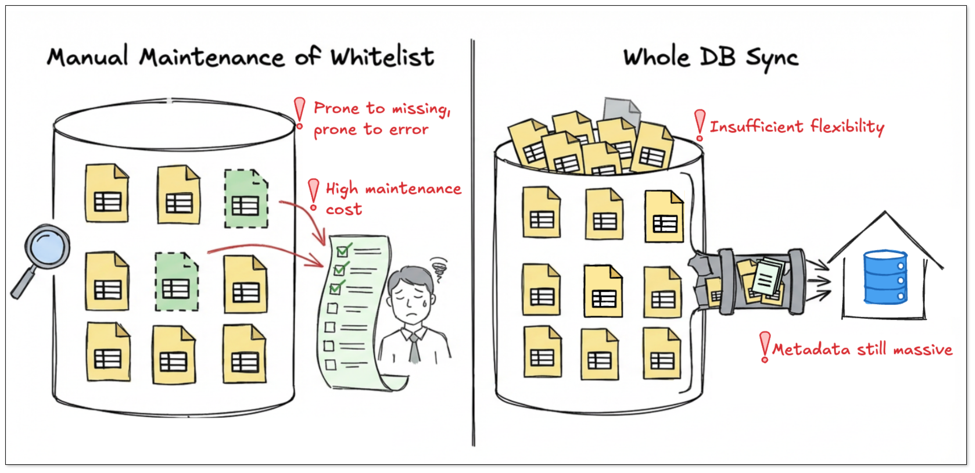 多表同步的挑战,并不只是数量多,而是表规模扩大带来的复杂性,尤其当表的数量达到千级或万级后,传统方式的同步有效性会大打折扣。
