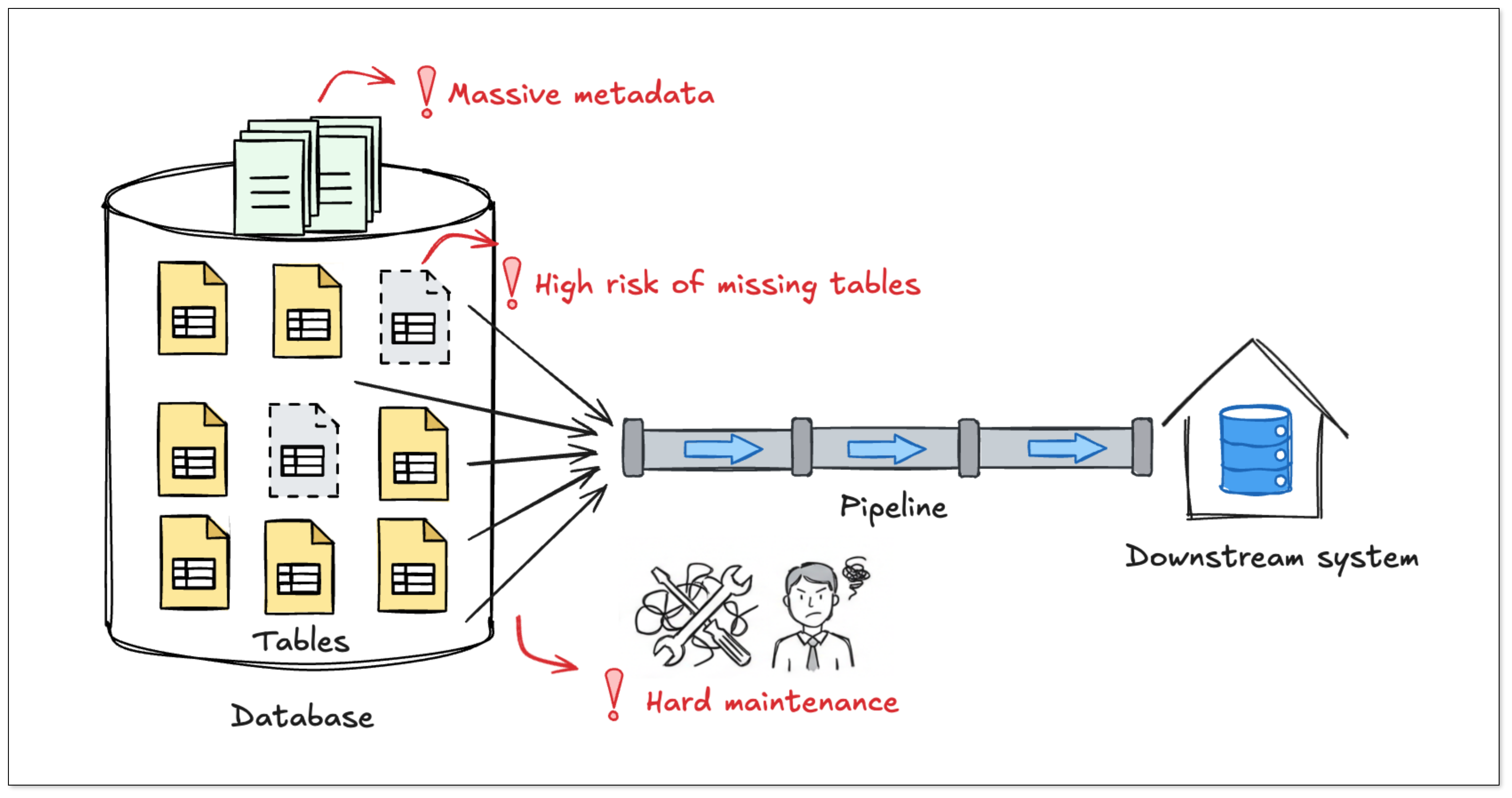 在现代业务环境中,“表太多” 已成为数据库同步领域越来越普遍的现象。一个成熟的业务背后,数据库中经常有几千张甚至上万张表。在这种规模下,一旦某张表未被同步,下游数仓和分析链路就可能出现断层。