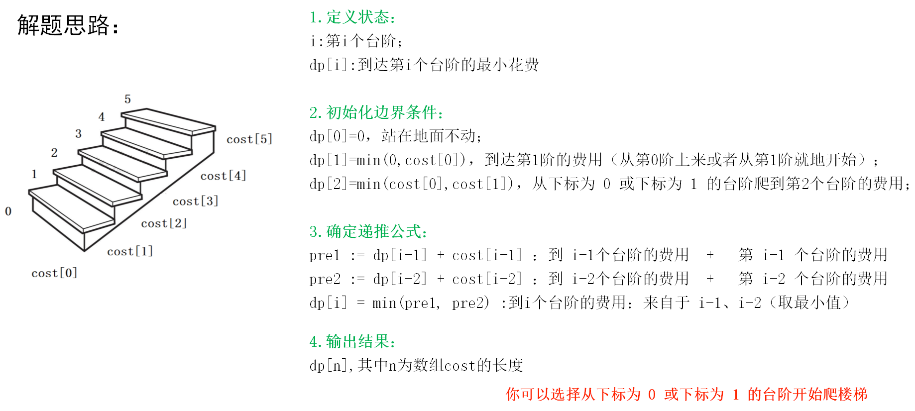 dp[1] = min(0, cost[0]) // dp[1]=cost[0],到达第1阶的费用(从第0阶上来或者从第1阶就地开始);