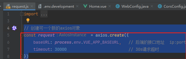 而 VUE_APP_BASEURL 正是我们在.env.development(开发环境)文件和.env.production(发布环境)文件中配置的ip:port,我自己的项目配置如下: