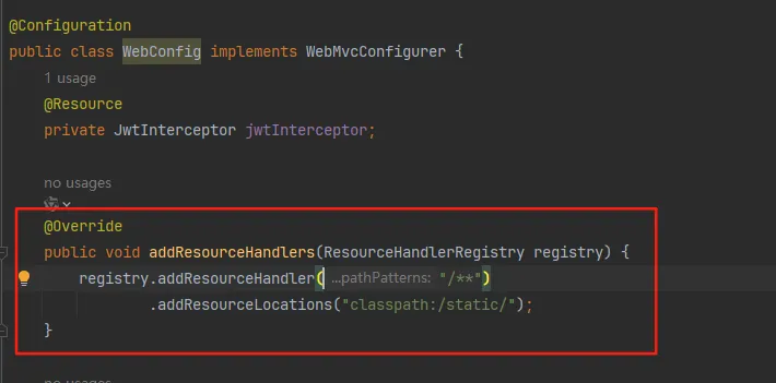 addResourceHandler("/**"):匹配所有路径的静态资源请求 addResourceLocations("classpath:/static/"):指定静态资源的查找位置为classpath下的static目录 这样配置后,项目可以正确访问和加载位于static文件夹中的静态资源文件(如CSS、JS、图片等)。