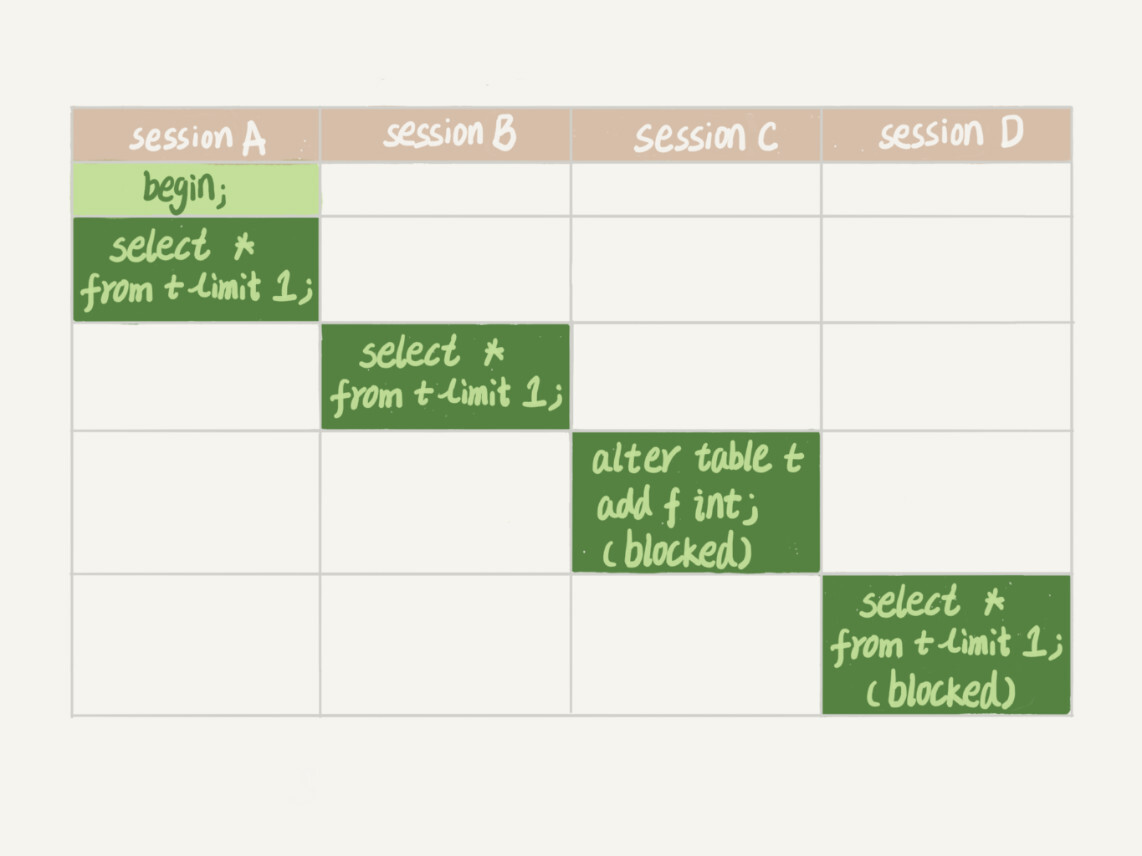 之后 session C 会被 blocked,是因为 session A 的 MDL 读锁还没有释放,而 session C 需要 MDL 写锁,因此只能被阻塞。