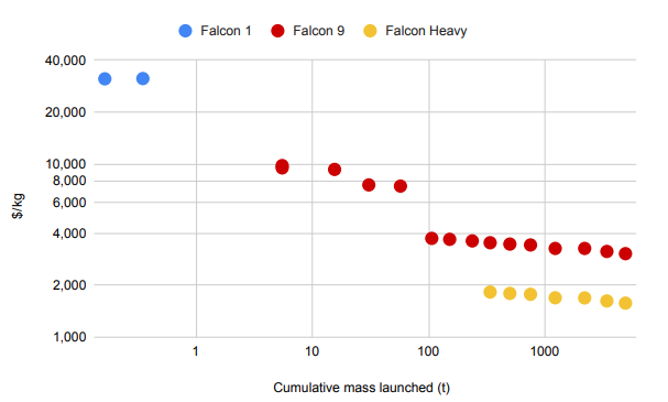 他们翻出了SpaceX的“学习曲线”:从猎鹰1号到猎鹰9号再到猎鹰重型,每次累积发射质量翻倍,每公斤的发射成本就下降约20%。如果这个趋势能保持(这需要像星舰这样的大运力可回收火箭成功,并保持每年约180次的高频发射),那么到2035年左右,近地轨道的发射成本有望降到200美元/公斤以下。