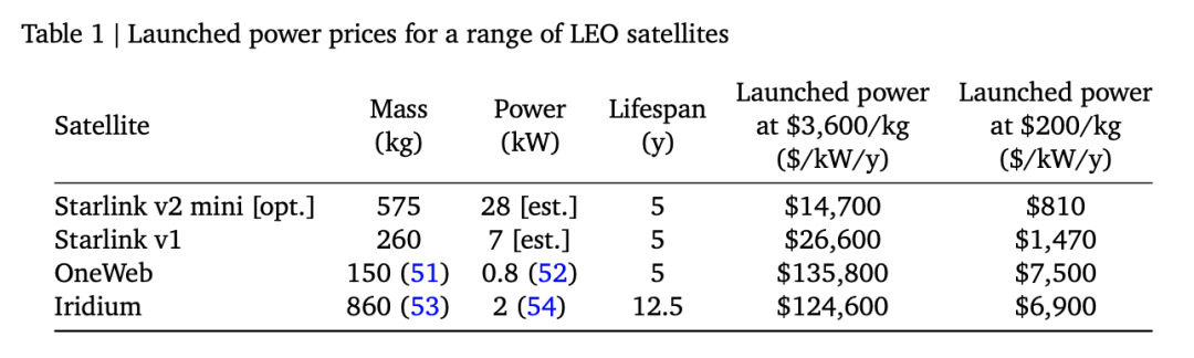 论文算了笔账:如果发射成本降到200美元/公斤,那么像星链V2迷你版这样的卫星(重575公斤,功率约28千瓦),其平摊到每年的“发射能量成本”约为810美元/千瓦/年。
