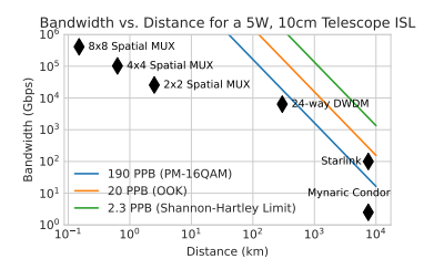怎么办?把卫星间距从几千公里缩小到几百公里,能量就够用了。再近到10公里级别,甚至能玩“空间多路复用”——在一个口径里塞进多束独立激光,带宽还能再翻倍。