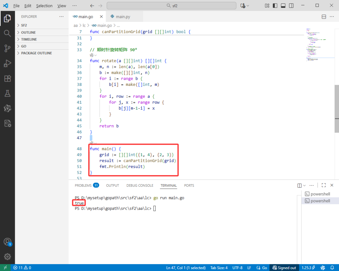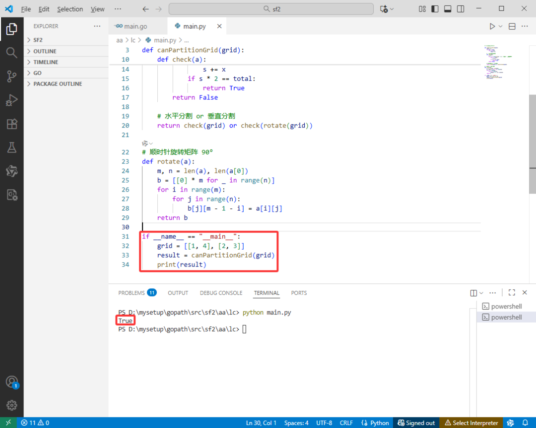 grid 是 m 行 n 列。rotated,它是 n 行 m 列。rotated[j][m-1-i] = grid[i][j]。如果水平分割或垂直分割任意一种情况满足条件,就返回 true,否则 false。