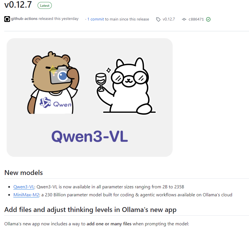 Ollama 在 2025 年 10 月 30 日正式发布了 v0.12.7 版本,该版本带来了多个重要更新,包括新模型的加入、应用功能增强、API 文档更新,以及一系列优化与修复。下面我们来详细解析 v0.12.7 的更新内容。