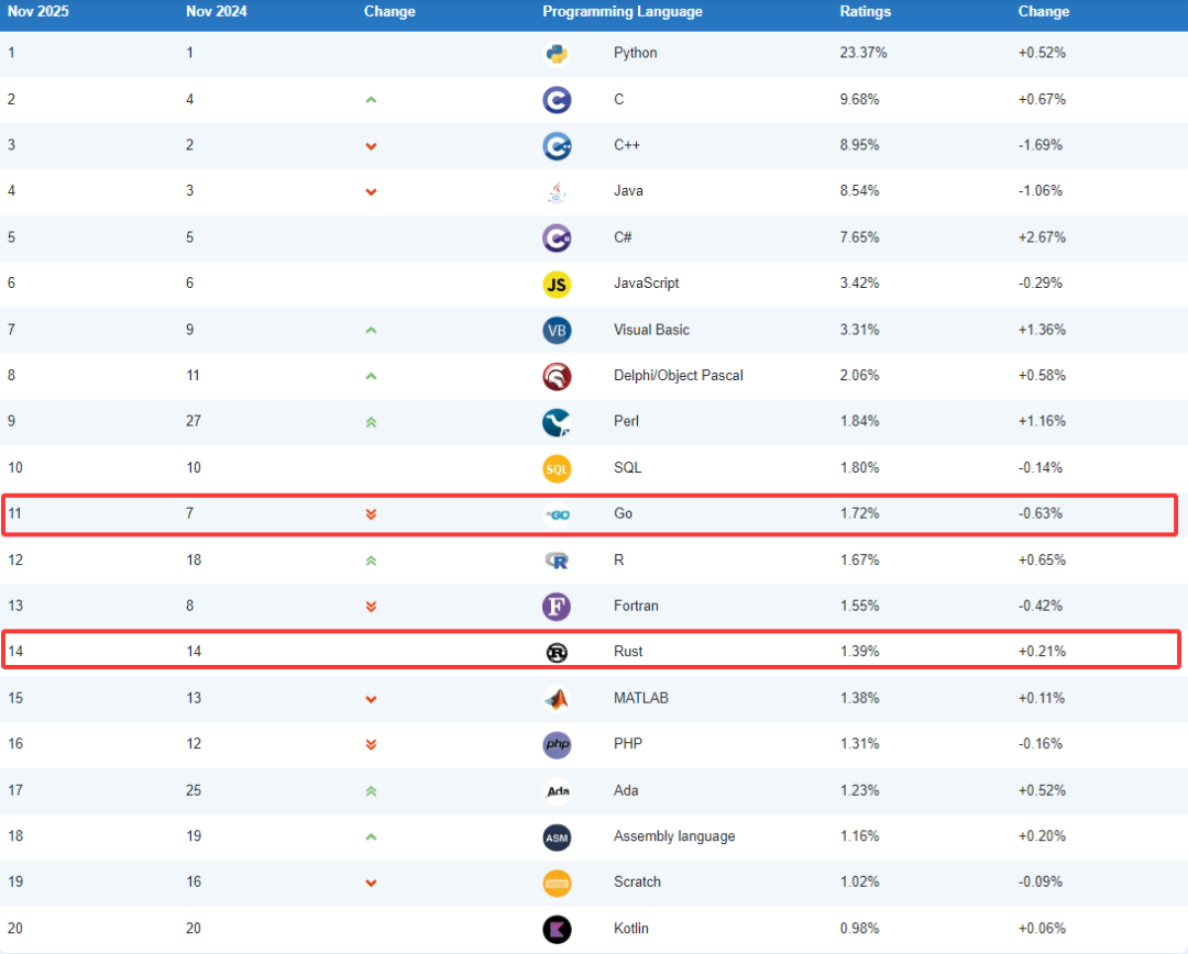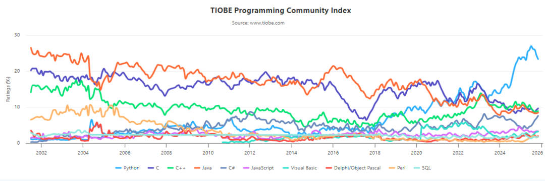 直到最近,还没有任何语言的增长速度能超过 Python。但如今,Python 的增长似乎进入了平台期。取而代之的是,C# 成为了目前上升最快的编程语言。如果 C# 能保持这一势头,它甚至有可能成为 2025 年 TIOBE 年度编程语言。