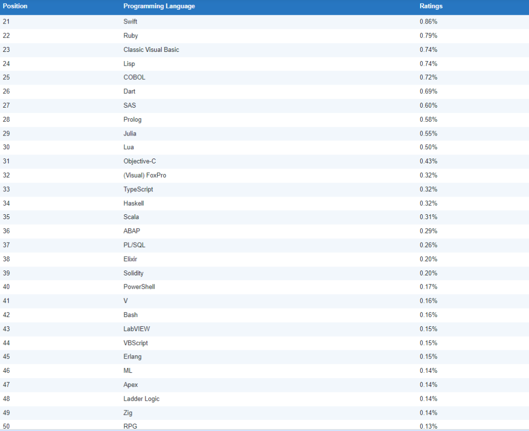完整的前 50 名编程语言榜单如下。该概览是非官方发布的,因为我们有可能遗漏了某些语言。