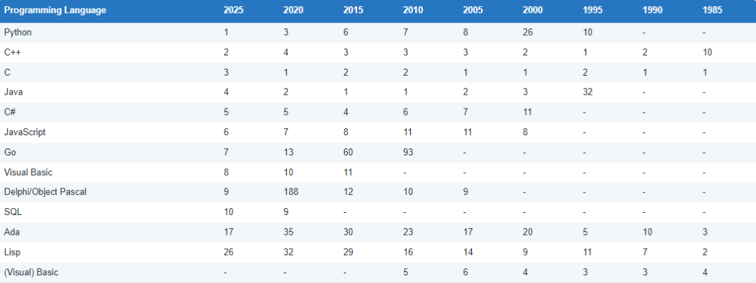 为了获得更宏观的视角,以下是若干年前 前 10 名 编程语言的排名情况。这些名次是以 12 个月的平均排名 计算得出的。