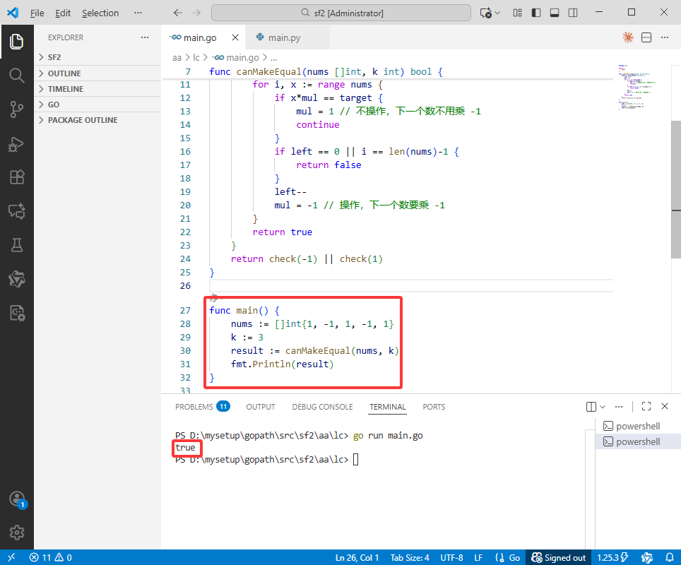 2025-11-23:数组元素相等转换。用go语言,给出一个长度为 n 的数组 nums,元素仅为 1 或 -1,和一个非负整数 k。