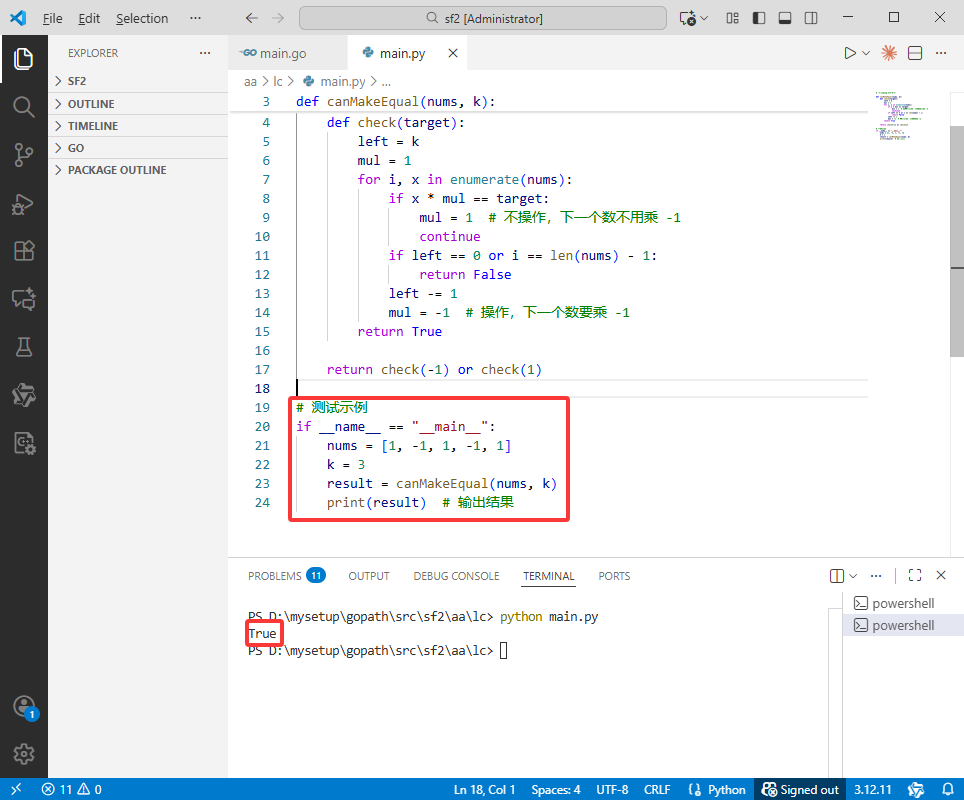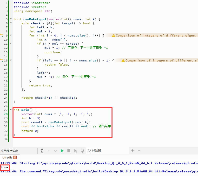 1 或者全部是 -1。因此,它会分别针对这两种情况(target = 1 和 target = -1)进行独立的检查。k 内实现,函数就会返回 true。这是一种常见的解题思路,通过枚举有限的可能结果来简化问题。left:剩余的可执行操作次数,初始值为 k。mul:一个乘数因子(其值为 1 或 -1),用于表示由于之前位置的操作对当前正在检查的元素造成的累积符号翻转效应。初始值为 1,表示没有累积影响。nums[i],算法计算其当前的有效值 nums[i] * mul。这个有效值反映了在考虑了之前所有操作的影响后,该元素当前“表现”出的符号。nums[i] * mul 等于目标值,说明当前位置的元素符号已经是正确的,不需要执行操作。mul 重置为 1。这意味着之前的操作链影响到此结束,下一个元素 nums[i+1] 的符号不会被本次遍历中之前的操作所影响。nums[i] * mul 不等于目标值,说明需要执行一次操作来翻转 nums[i] 和 nums[i+1] 的符号。left 大于 0;② 当前索引 i 不是数组的最后一个元素(因为操作需要同时改变 i 和 i+1 位置)。left 减少 1。mul 设置为 -1。这个操作非常关键:它意味着由于在位置 i 执行了翻转,下一个元素 nums[i+1] 的符号将会被改变。因此,在检查下一个位置时,需要通过乘以 -1 来“补偿”这次操作产生的影响。这个机制模拟了操作效应沿着数组向后传播的过程。k 次操作内使所有元素变为当前检查的目标值,返回 true。false。nums 的长度。因此,总的时间复杂度是 O(n)。left, mul, 循环变量 i 等),这些空间开销不随输入数组的大小 n 而变化。因此,总的额外空间复杂度是 O(1)。.