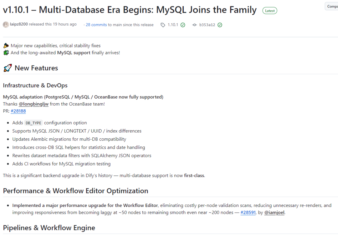 2025年11月26日,Dify 正式发布 1.10.1 版本,这次更新不仅带来了重大功能增强和稳定性修复,更标志着 Dify 进入了 多数据库新时代 —— MySQL 支持终于到来,并与 PostgreSQL、OceanBase 一起形成完整的多数据库体系。