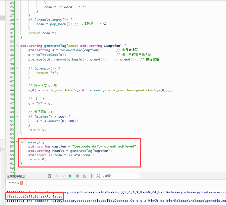 在驼峰形式字符串的开头添加#字符。然后,将#后的第一个字符(即原第一个单词的首字母)转换为小写,以确保第一个单词全部小写,而后续单词保持首字母大写。例如,"LeetcodeDailyStreakAchieved"添加#后变为"#LeetcodeDailyStreakAchieved",接着将首字母L小写化为l,最终得到"#leetcodeDailyStreakAchieved"。这一步通过字符串拼接和unicode.ToLower 实现。# 外的英文字母(A-Z、a-z)。但由于输入字符串 caption 仅包含英文字母和空格,且空格已在步骤3中被移除,因此无需额外过滤操作。这一约束条件自动满足了要求。#)。如果长度超过100个字符,则保留前100个字符,截断右侧多余部分。例如,若结果字符串为120字符,则截取前100字符。这一步通过切片操作实现,确保输出符合长度限制。ToLower 和 Title 转换器)各需遍历字符串一次,时间复杂度为 O(n)。ReplaceAll)需遍历并构建新字符串,时间复杂度为 O(n)。# 和调整首字母涉及字符串拼接和切片,最坏情况下需复制字符串,时间复杂度为 O(n)。caption 的长度。ToLower 和 Title 转换各产生一个新字符串,ReplaceAll 和拼接操作也会分配新内存。因此,总额外空间复杂度为 O(n)。"#leetcodeDailyStreakAchieved" 符合题目要求:首单词全小写,后续单词首字母大写,且以 # 开头。.
