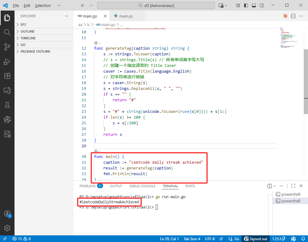 caption 全部转换为小写字母。这一步旨在统一大小写,为后续的标题格式转换做准备。例如,"Leetcode daily streak achieved" 会被转换为 "leetcode daily streak achieved"。转换通过 strings.ToLower 实现,它会遍历字符串中的每个字符并将其小写化。cases.Title 转换器(针对英语配置)将字符串转换为标题格式。标题格式的定义是:每个单词的首字母大写,其余字母保持小写。例如,"leetcode daily streak achieved" 会被转换为 "Leetcode Daily Streak Achieved"。这一步骤确保了单词边界的正确识别,与标准的标题格式化逻辑一致。"Leetcode Daily Streak Achieved" 在移除空格后变为 "LeetcodeDailyStreakAchieved"。此时,字符串已具备驼峰形式的雏形,但第一个单词的首字母仍是大写的。# 并调整首单词为全小写