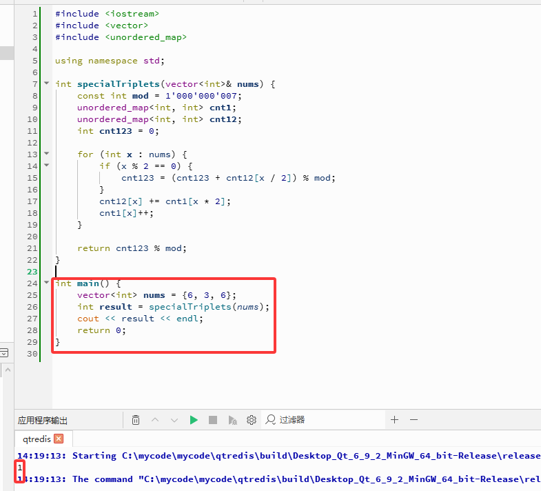 最后,将 x 视为 nums[i],简单增加 cnt1[x] 的计数,为后续 j 或 k 的匹配做准备。cnt123 即为所有满足条件的三元组总数。返回 cnt123 % 1_000_000_007 以确保结果在模数范围内。O(n),其中 n 是数组长度。代码仅对数组进行一次线性遍历,每个元素处理过程中对映射的查询、插入和更新操作均摊时间复杂度为 O(1)(基于哈希映射实现)。O(n)。主要来自三个映射 cnt1、cnt12 和 cnt123 的存储。在最坏情况下,映射中的键数量与数组长度 n 成正比(例如所有元素互异时),因此空间复杂度为线性。O(n³)),实现了高效统计。这种方法类似于动态规划中“用空间换时间”的策略,逐步构建子问题的解。.