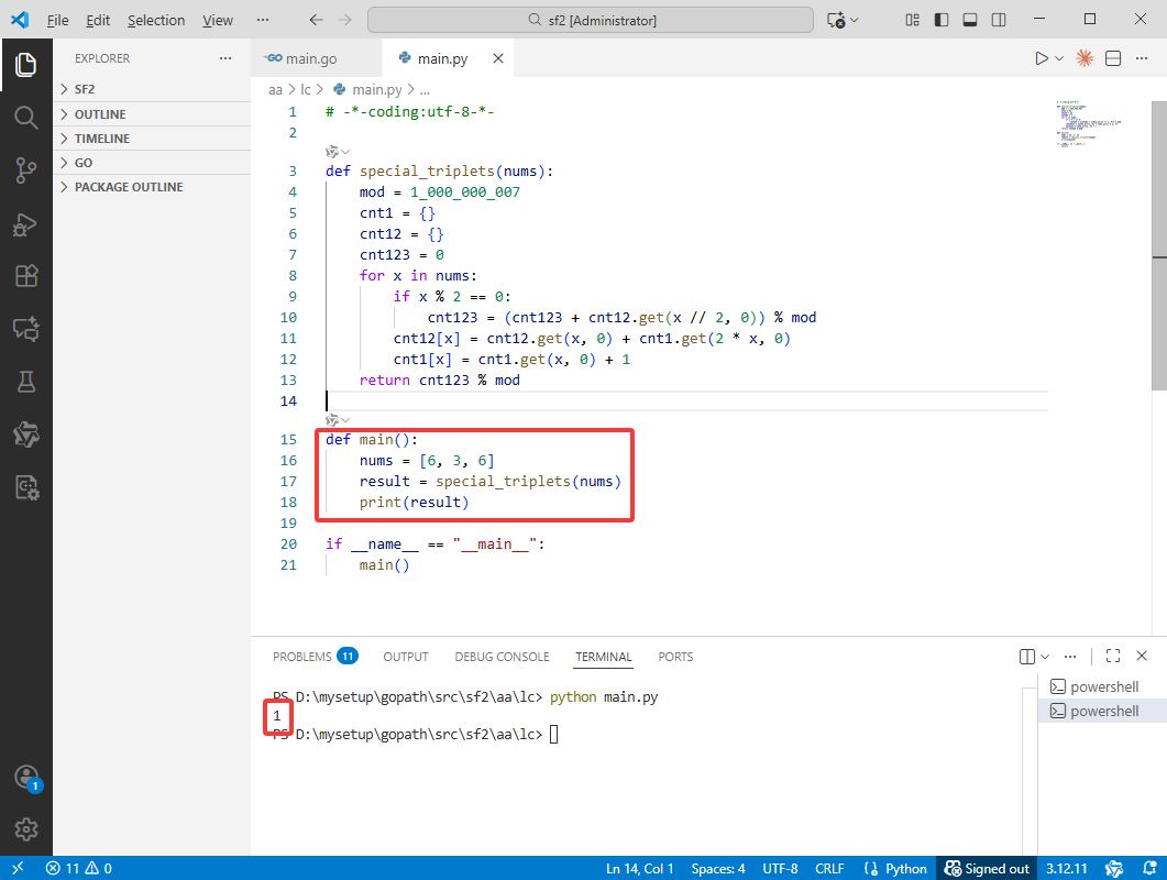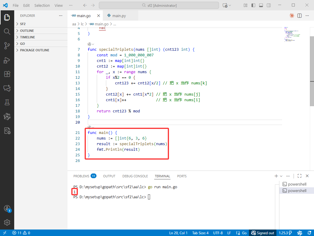 2025-11-28:统计特殊三元组。用go语言,给定一个整数数组 nums。我们把满足 i<j<k(索引从 0 开始)且 nums[i] 和 nums[k] 都等于 nums[j] 的两倍的三个不同索引 (i, j, k) 称为“一组特殊三元组”。要求计算数组中所有这样的三元组数量,并将结果对 1000000007 取模后返回。