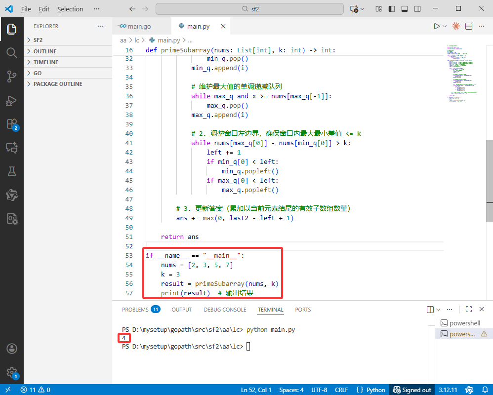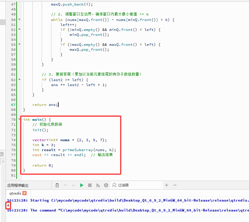np用于标记非质数(np[i]为true表示i不是质数)。i,标记其所有倍数(从i*i开始)为非质数。这一步确保在后续处理中能以O(1)时间判断任意数是否为质数。函数primeSubarray使用双指针(滑动窗口) 结合单调队列来动态维护窗口内的质数极值: