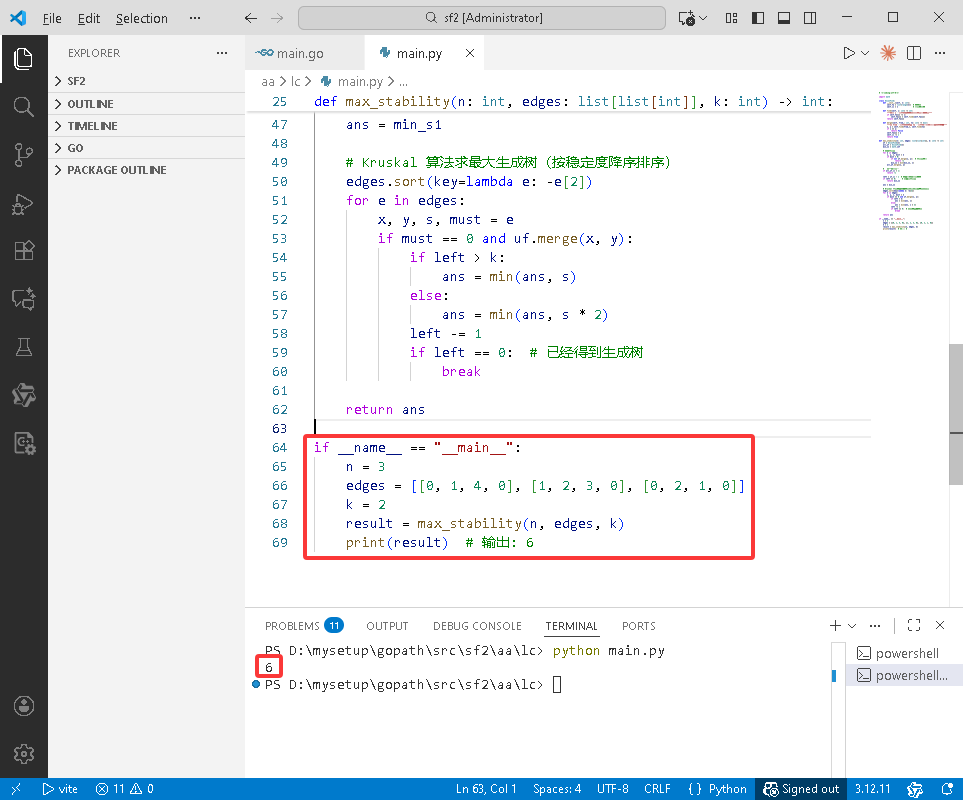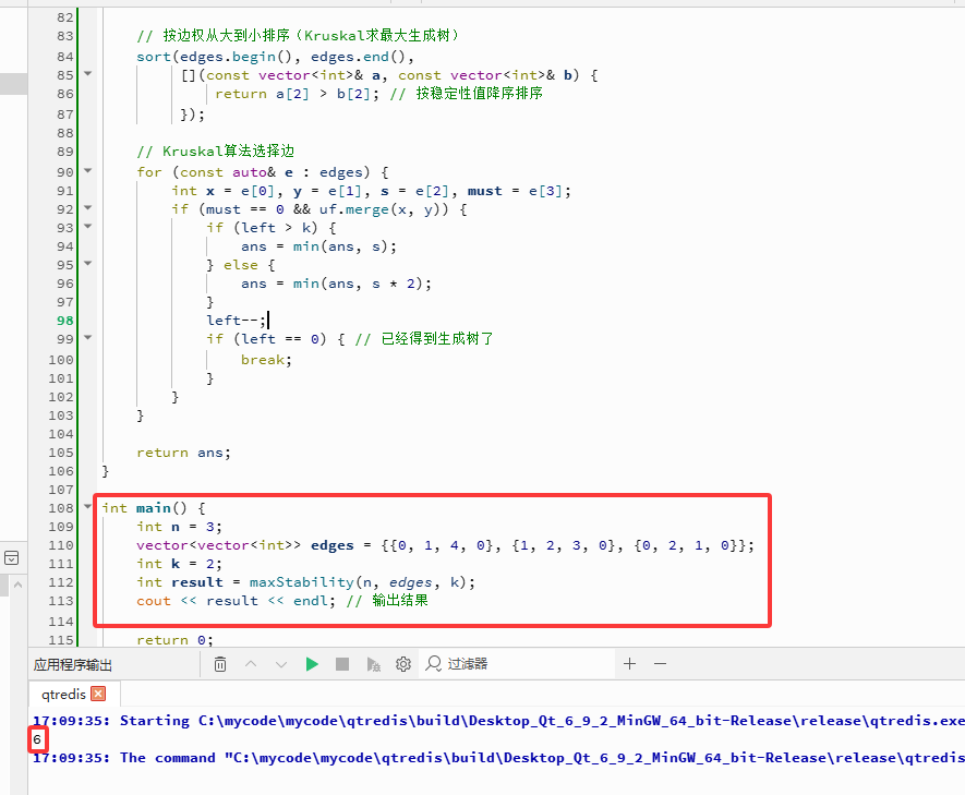 left == 0,说明仅凭必选边就已经构成了生成树。此时,生成树的稳定性就是必选边中的最小强度 minS1,直接返回该值。如果还需要添加可选边,则采用类似Kruskal最大生成树算法的策略: