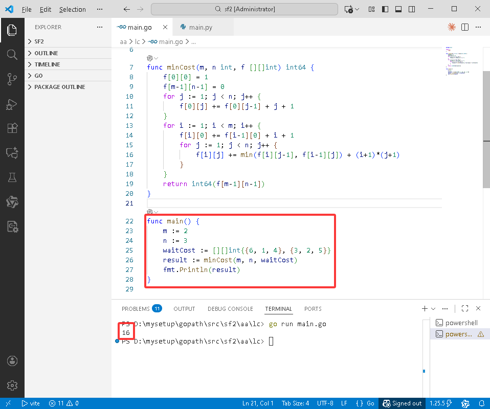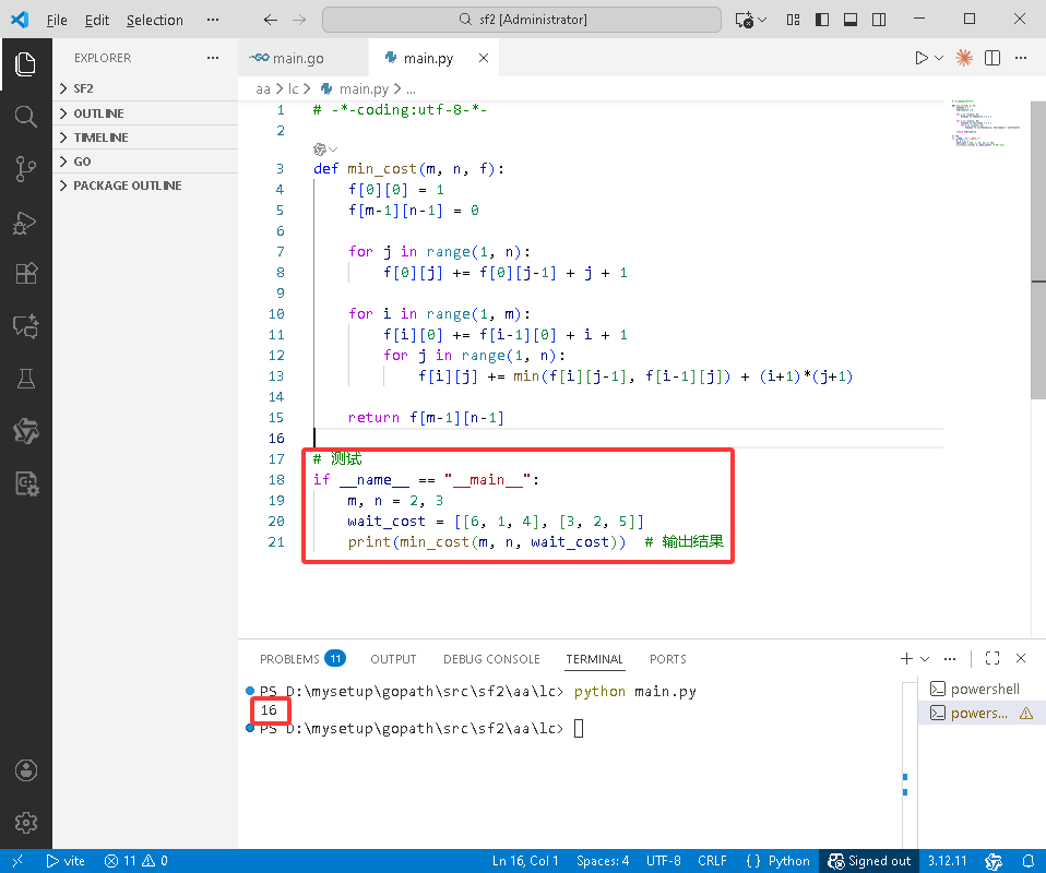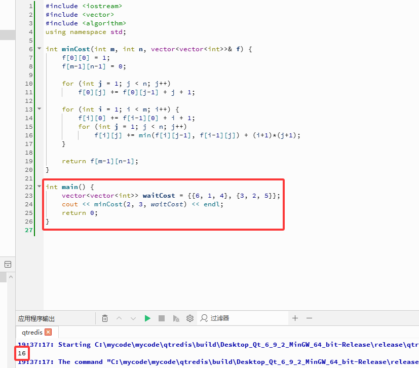 (0+1)*(0+1) = 1。这覆盖了输入waitCost矩阵中在(0,0)处的原始值(原为6)。waitCost[0][j]的初始值)加上左侧单元格(0,j-1)的累积代价,再加上当前单元格的进入代价j+1(因为i=0,进入代价为1*(j+1)=j+1)。f[0][1] = f[0][1] + f[0][0] + 1 + 1(初始f[0][1]为1,f[0][0]为1,结果为1+1+1+1=4)。waitCost[i][0]的初始值)加上上方单元格(i-1,0)的累积代价,再加上当前单元格的进入代价i+1(因为j=0,进入代价为(i+1)*1=i+1)。f[1][0] = f[1][0] + f[0][0] + 1 + 1(初始f[1][0]为3,f[0][0]为1,结果为3+1+1+1=6)。waitCost[i][j]的初始值)加上左边或上边单元格累积代价的最小值,再加上当前单元格的进入代价(i+1)*(j+1)。min(f[1][0], f[0][1]) + (1+1)*(1+1) = min(6,4) + 4 = 4 + 4 = 8,然后加上初始f[1][1]=2,结果为10。f[m-1][n-1]即为最小总代价。在示例中,f[1][2]最终计算为16。需要注意的是,题目描述的交替规则(奇数秒移动、偶数秒等待)在代码中并未显式处理。代码实际上实现了一个标准的最小路径和DP,其中每个单元格的代价是进入代价,而等待代价可能通过初始waitCost矩阵的修改被间接包含,但从代码逻辑看,等待代价未被正确集成。输出结果与题目示例匹配的原因可能是DP计算巧合地覆盖了实际代价。
