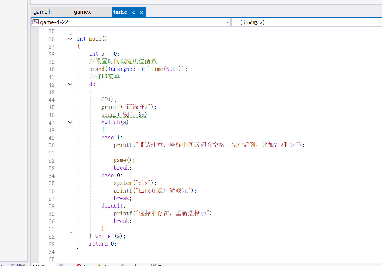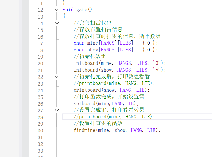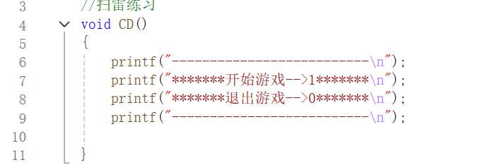 开始之前建议分为三部分,1.头文件->函数的定义,2.游戏实现函数,3.游戏的控制中心