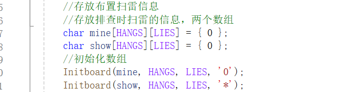 首先,初始化数组:将mine初始化全是‘0’的棋盘,show初始化成全是 ‘*’ 的棋盘
