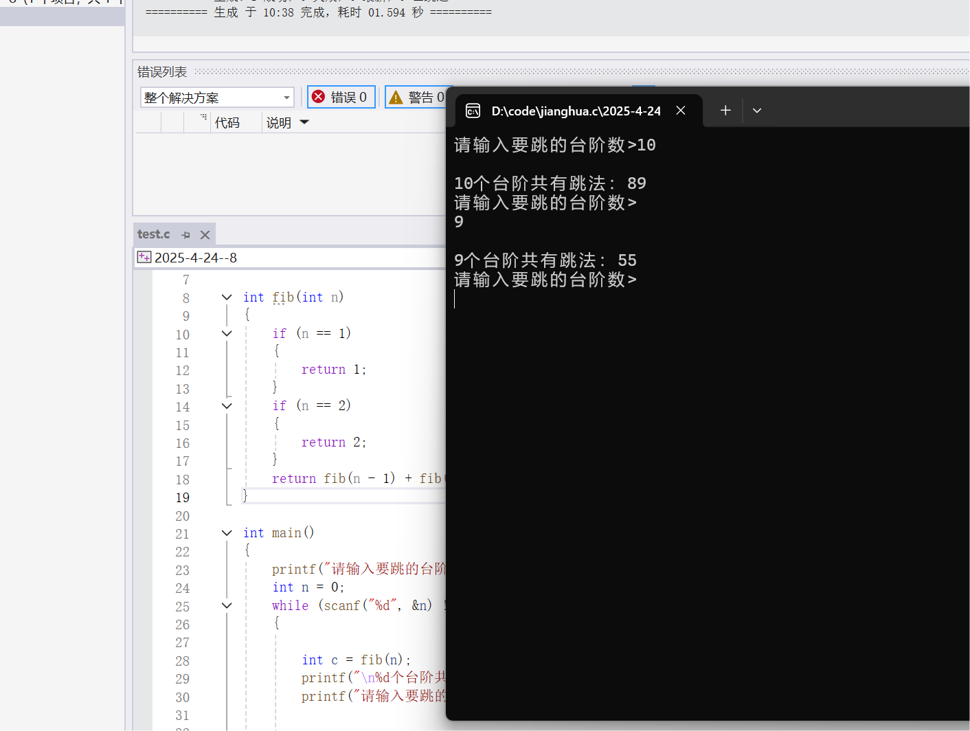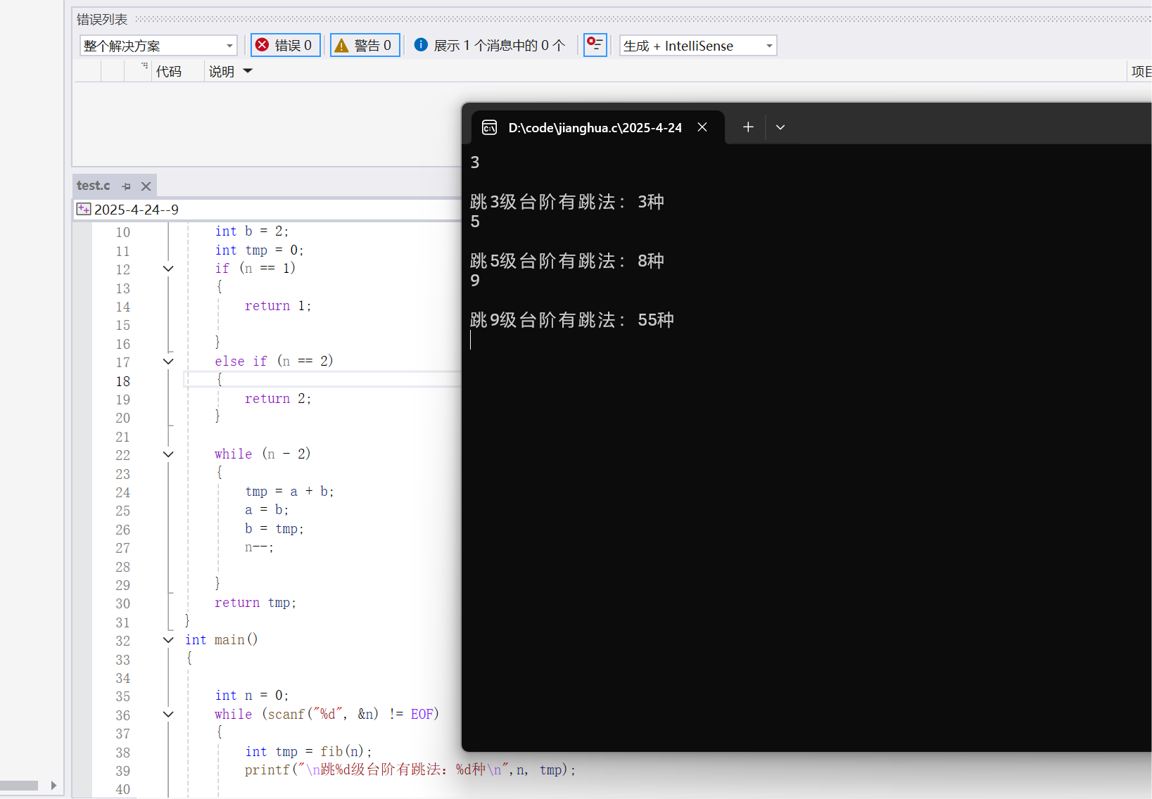 1.由图可以看出:剩n个台阶时我们有fib(n)种跳法