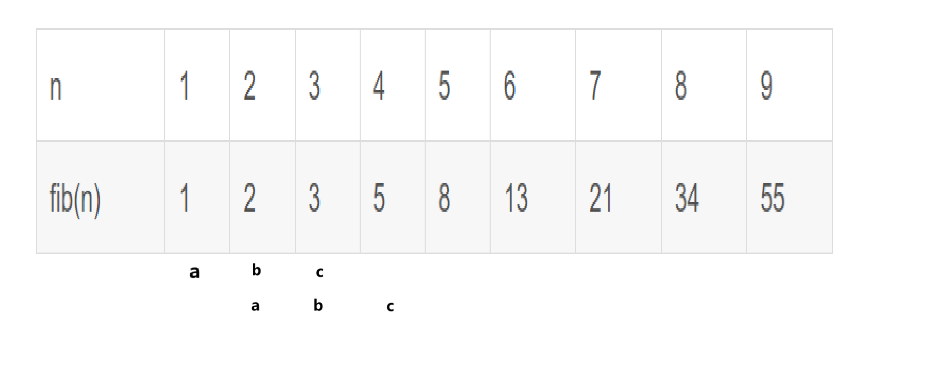 fib(n) | 1 | 2 | 3 | 5 | 8 | 13 | 21 | 34 | 55 |