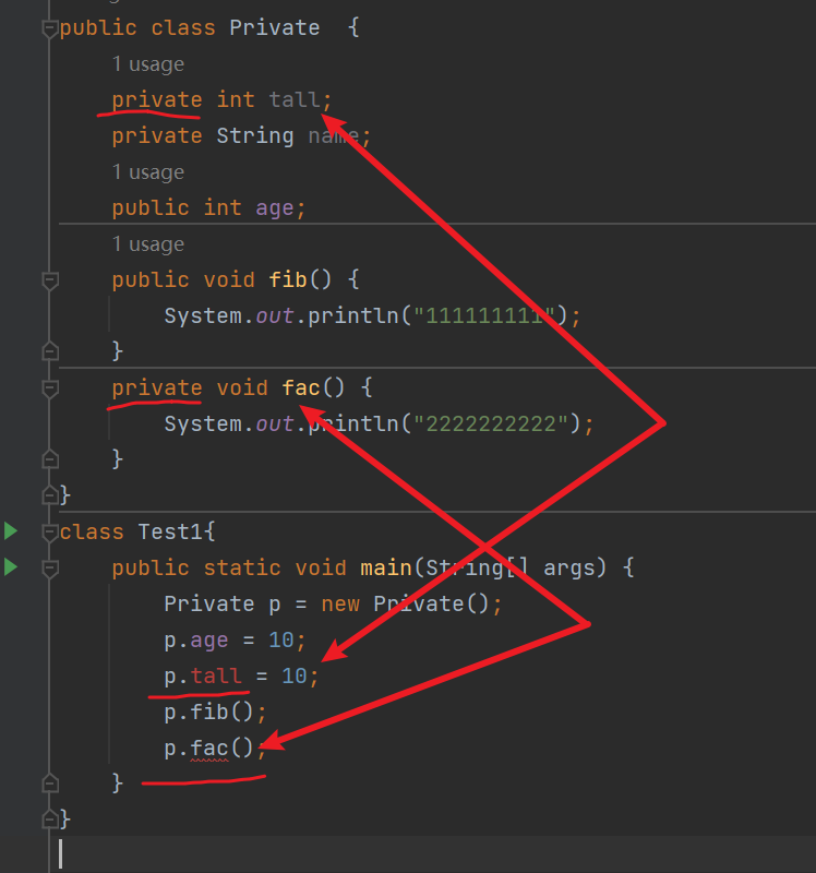 我们发现图片中在不同类当中通过对象不能引用被private修饰的成员变量和成员方法,会爆红线,编译不能通过