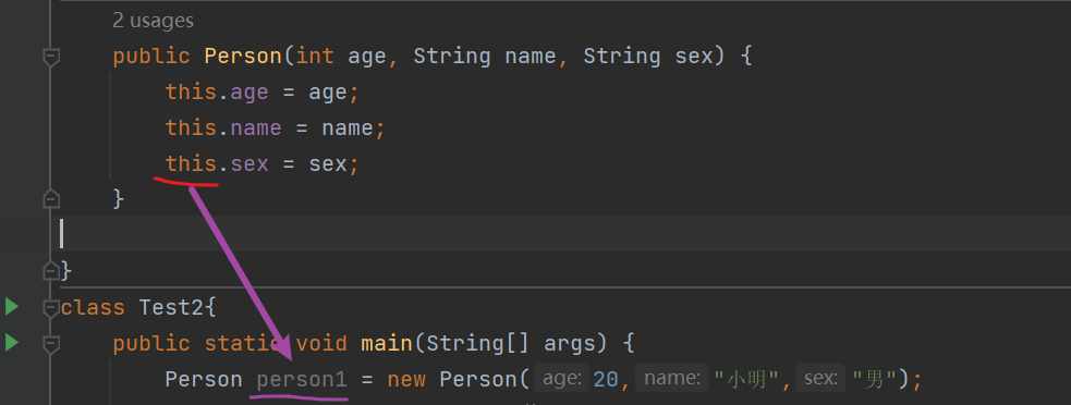 Person person = new Person(20,"小明","男");