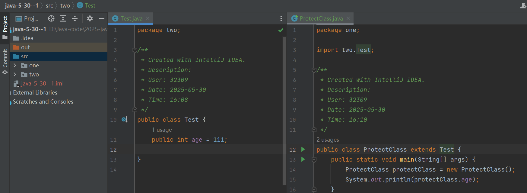 中文翻译为受保护的,顾名思义,跟我有直接或者间接关系的才受保护,跟我没有一点关系的,不受保护,同一个包属于有关系,不同包的子类那也是有关系,要是不同包的不同子类显然是没有关系的,所以只能在同一个包或者不同包子类使用