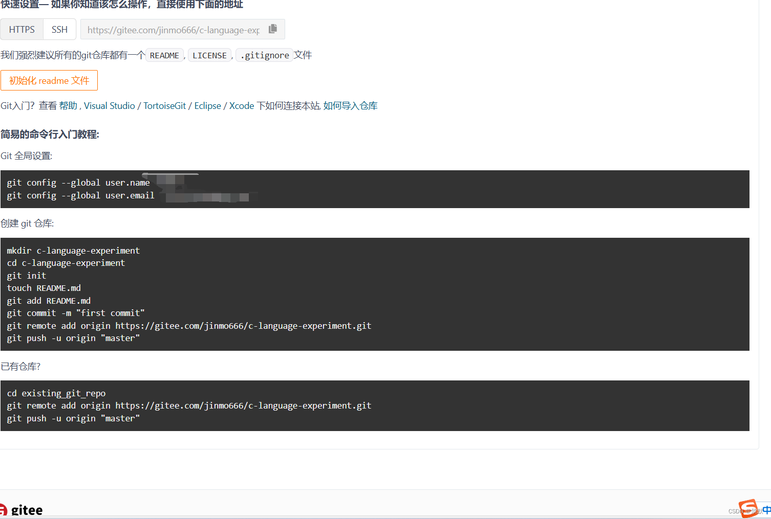 在创建仓库成功后,出现的界面中有个Git全局设置,下面有两行命令,在终端输入就行。