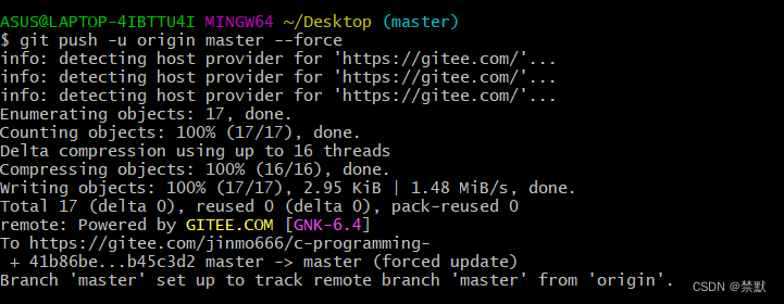 这将强制将本地的master分支推送到名为origin的远程仓库,并覆盖远程分支上的所有提交记录。