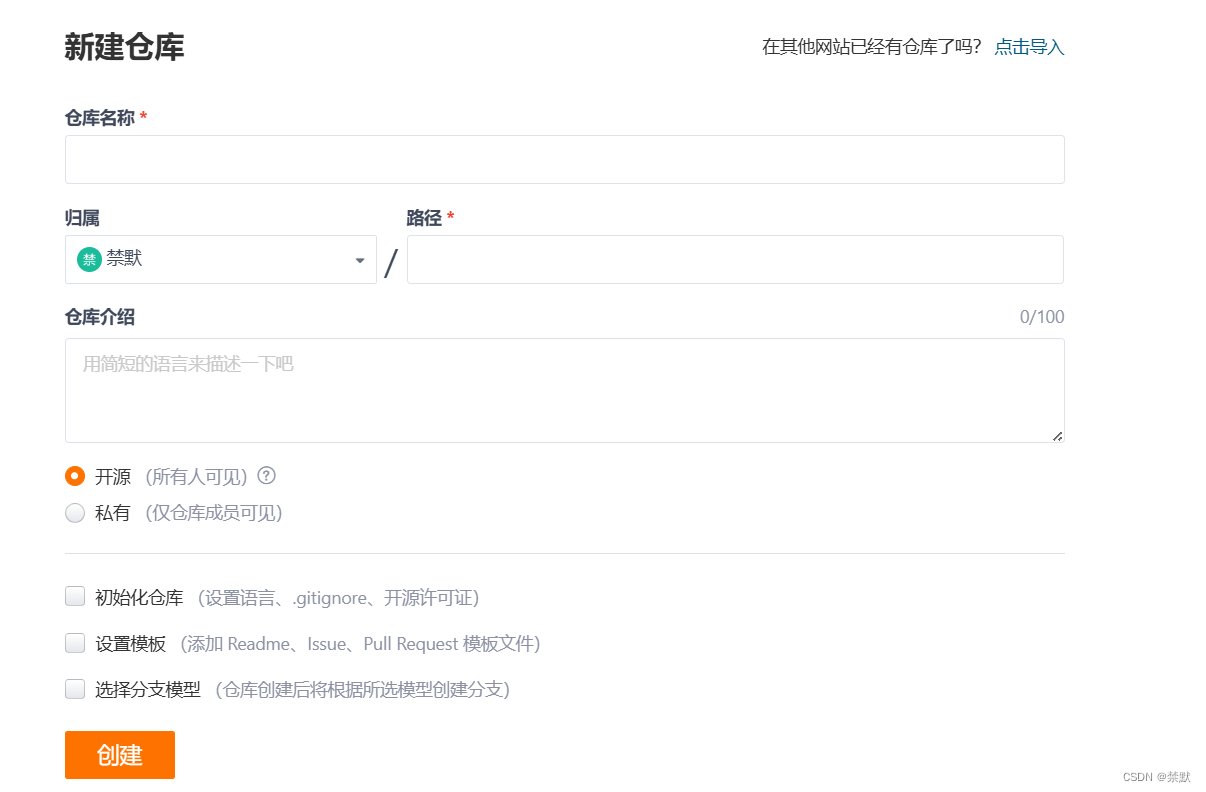 3.然后开始创建仓库。填写仓库名称等,路径会在填写名称过后自动生成,下面的选择根据自己需求选择,最后点击创建即可。