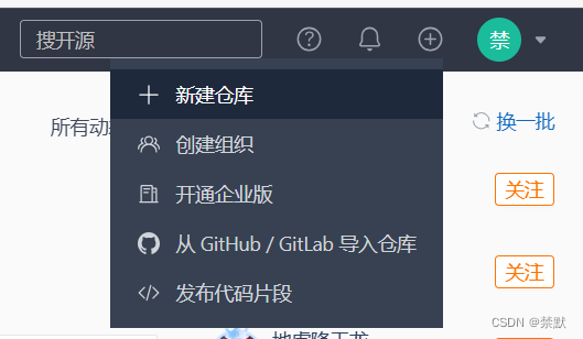 2.gitee创建仓库,在账号旁边有个圈圈+,点击,选择新建仓库即可。