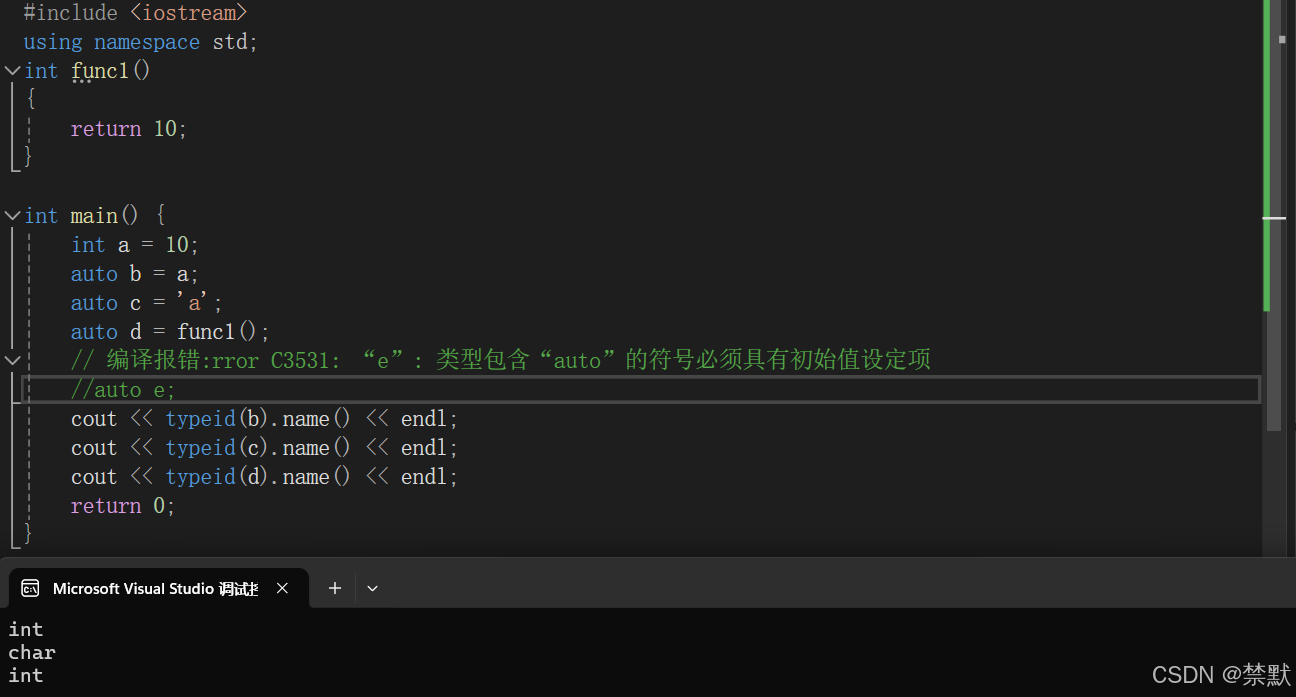 // 编译报错:rror C3531: “e”: 类型包含“auto”的符号必须具有初始值设定项