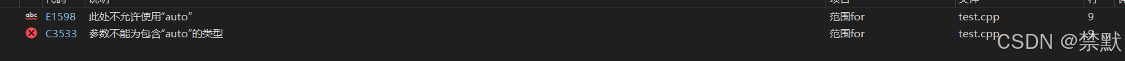 // 编译报错:error C3538: 在声明符列表中,“auto”必须始终推导为同一类型 auto cc = 3, dd = 4.0; // 编译报错:error C3318: “auto []”: 数组不能具有其中包含“auto”的元素类型 auto array[] = { 4, 5, 6 };