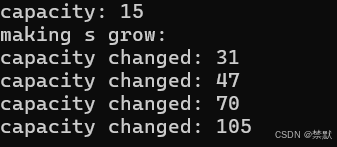 可根据自己的需求自行更改代码。不难发现capacity 的大小会根据字符串的大小变化可能进行相应的变化,变化情况见上capacity的介绍。linux下gcc和VS的capacity变化规则是略有不同的,大家可以下去尝试下。