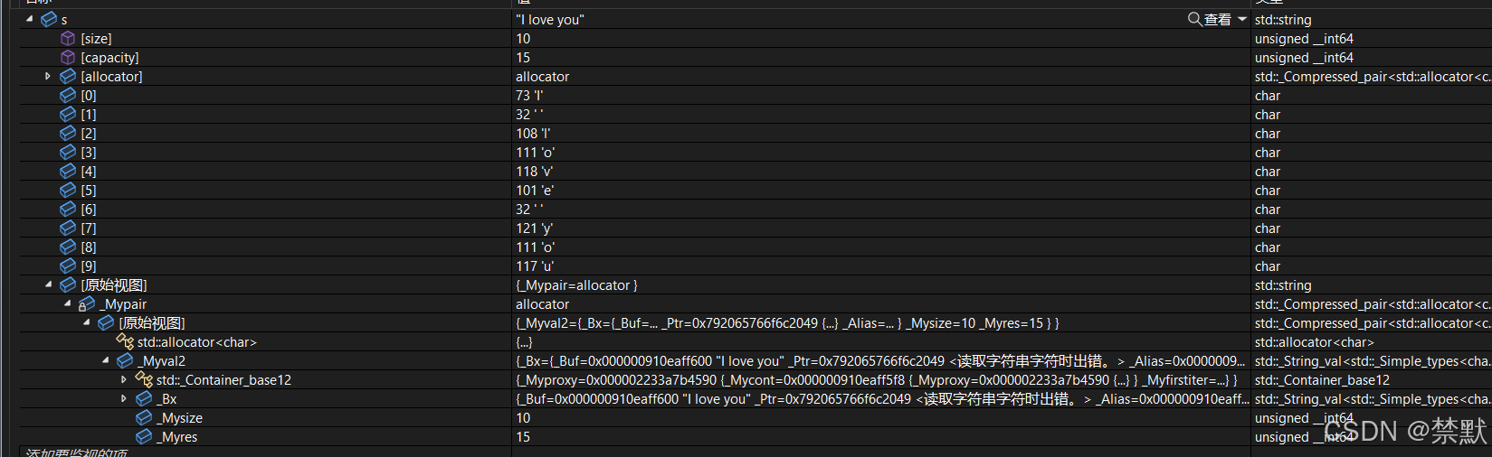 其次:还有一个size_t字段保存字符串长度,一个size_t字段保存从堆上开辟空间总的容量 最后:还有一个指针做一些其他事情。 故总共占16+4+4+4=28个字节。