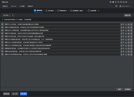 用它开发,简直像开了“倍速模式”,从需求到代码全程丝滑衔接。咱们先说说最头疼的需求转化环节——以前拿到“生成一个文件上传接口”这样的需求,得先自己拆解功能点:支持多格式、文件大小限制、进度反馈、安全校验、错误处理……少想一点后续就得返工。现在打开飞算JavaAI,直接用自然语言输入需求,甚至语音描述都能识别,系统会自动把需求细化成8个关键功能点,还能手动增删调整,再也不怕遗漏需求细节。