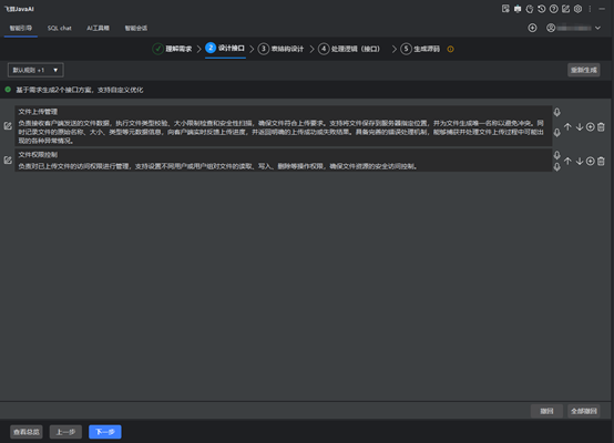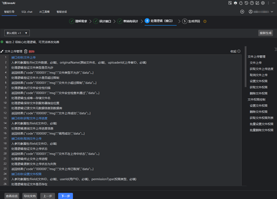 需求理清后,不用自己费脑设计接口。系统会根据需求自动拆分接口,比如文件上传需求就精准生成1个核心接口,把接收存储、格式限制、安全校验等所有功能都整合进去,接口描述清晰规范,还能按需修改或新增接口,省去了画流程图、写接口文档的功夫。