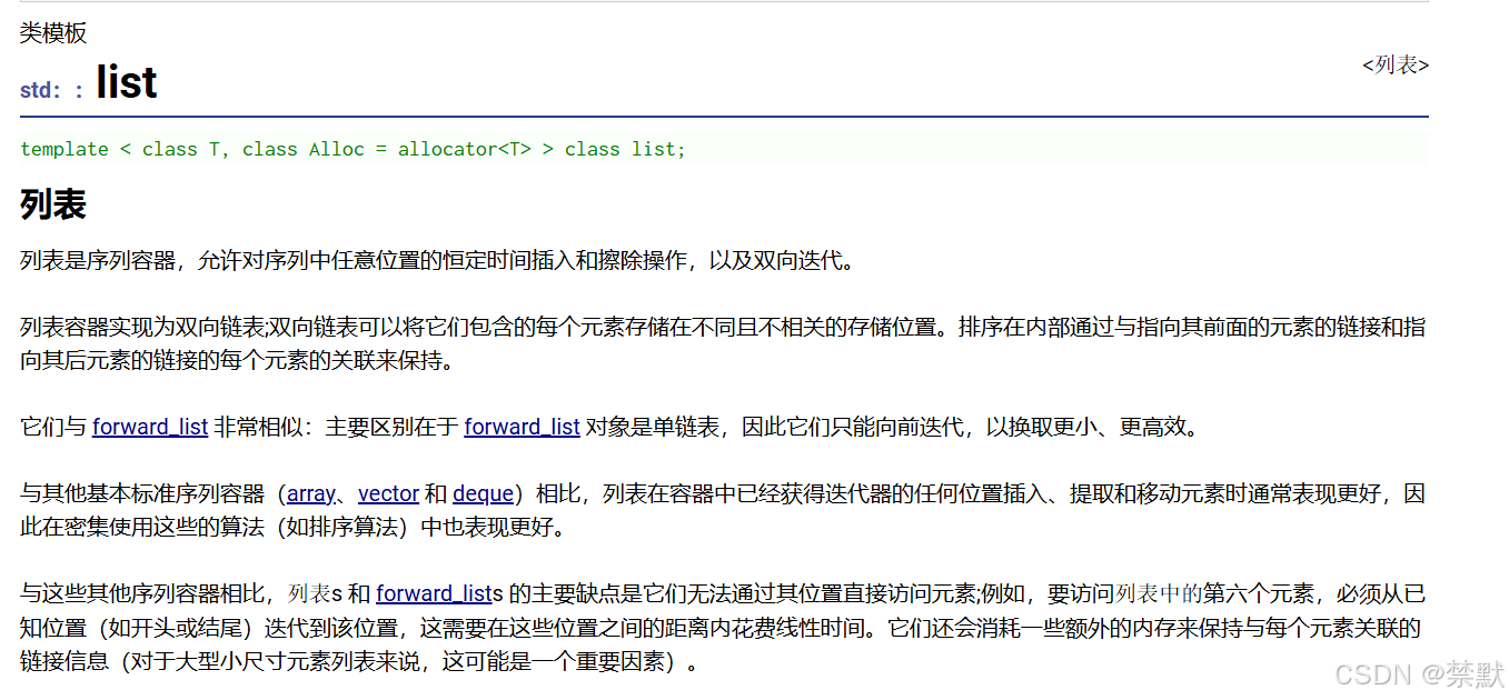 1. list是可以在常数范围内在任意位置进行插入和删除的序列式容器,并且该容器可以前后双向迭代。 2. list的底层是双向链表结构,双向链表中每个元素存储在互不相关的独立节点中,在节点中通过指针指向 其前一个元素和后一个元素。 3. list与forward_list非常相似:最主要的不同在于forward_list是单链表,只能朝前迭代,已让其更简单高 效。 4. 与其他的序列式容器相比(array,vector,deque),list通常在任意位置进行插入、移除元素的执行效率更好。 5. 与其他序列式容器相比,list和forward_list最大的缺陷是不支持任意位置的随机访问,比如:要访问list 的第6个元素,必须从已知的位置(比如头部或者尾部)迭代到该位置,在这段位置上迭代需要线性的时间 开销;list还需要一些额外的空间,以保存每个节点的相关联信息(对于存储类型较小元素的大list来说这可能是一个重要的因素)