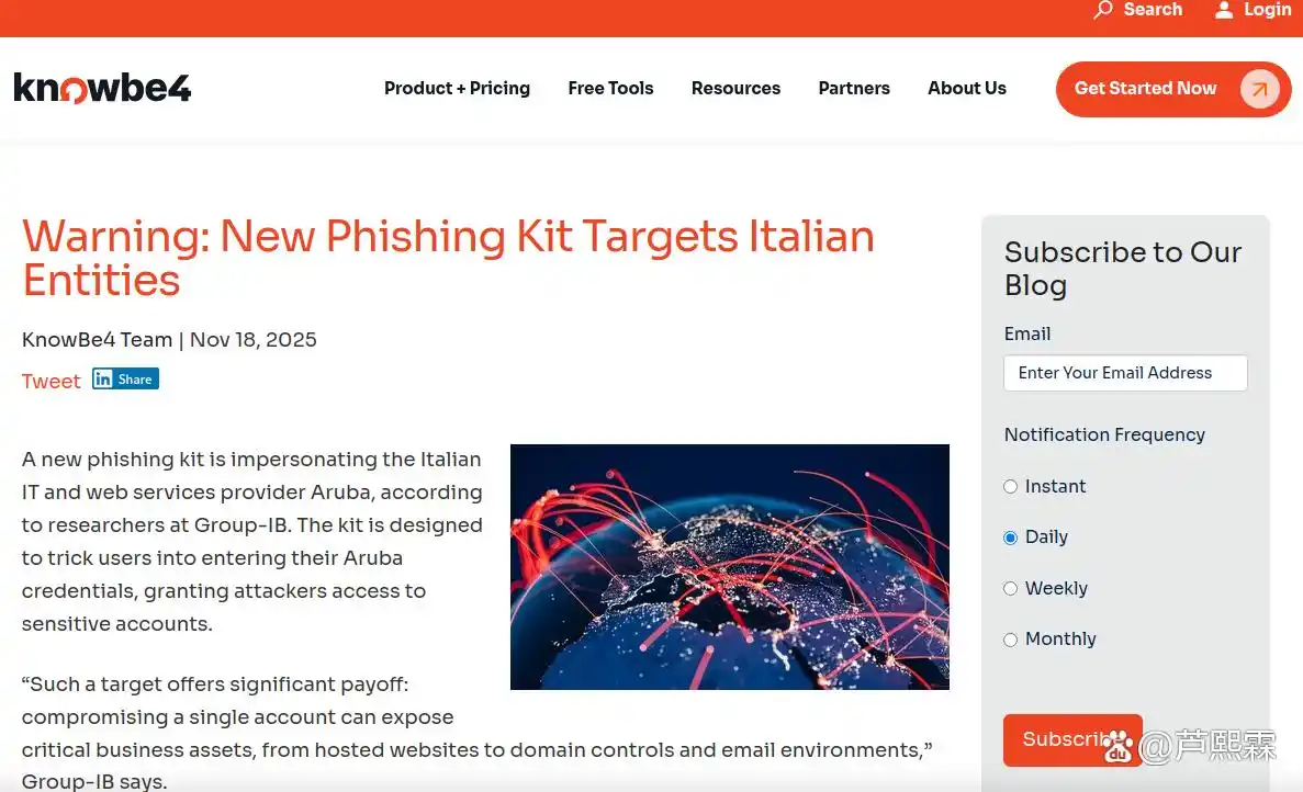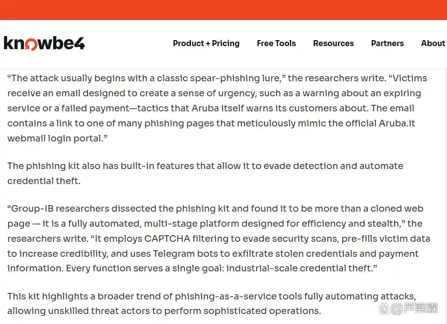 近年来,网络钓鱼(Phishing)攻击呈现出高度本地化、专业化和自动化的趋势。攻击者不再满足于广撒网式的通用模板,而是针对特定国家、语言、文化背景乃至行政体系定制钓鱼内容,以显著提升欺骗成功率。2025年11月,安全厂商Group-IB与KnowBe4联合披露了一款专门针对意大利实体的新型钓鱼工具包(Phishing Kit),该工具包以意大利主流IT服务提供商Aruba为伪装对象,通过伪造其Webmail登录页面窃取用户凭证,并利用Telegram Bot实现自动化数据回传。值得注意的是,该工具包不仅在前端界面高度仿冒官方站点,还在后端集成反检测、IP地理过滤、CAPTCHA绕过等高级功能,展现出“钓鱼即服务”(Phishing-as-a-Service, PhaaS)模式下的工业化特征。