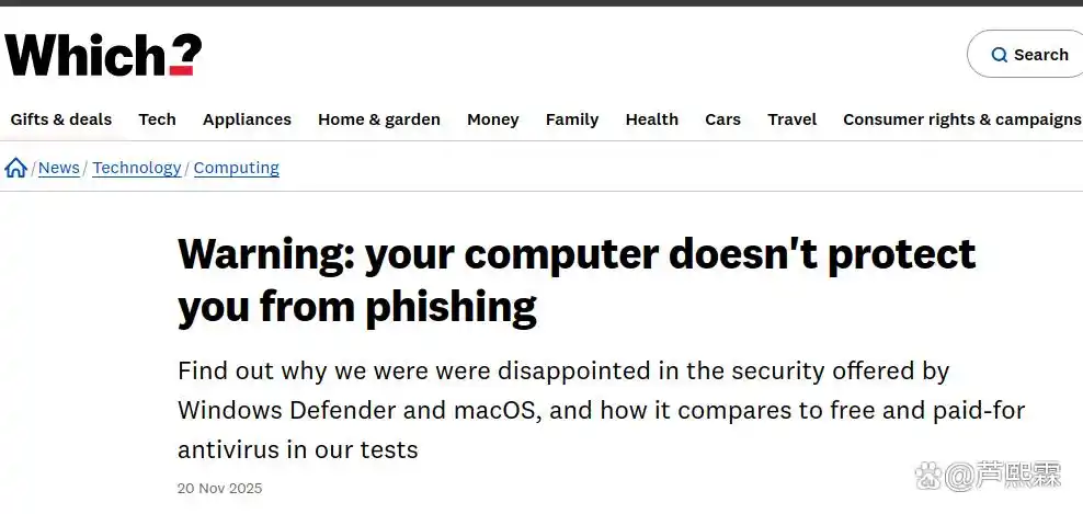 现代个人计算设备在出厂时普遍预装了操作系统级的安全防护机制,如 Microsoft Windows 的 Defender(含 SmartScreen)与 Apple macOS 的 Safari 集成防护(基于 Google Safe Browsing)。这些机制被广泛视为用户抵御网络威胁的第一道防线,尤其在普通消费者缺乏专业安全知识的背景下,其“开箱即用”的特性强化了用户对其有效性的默认信任。然而,2025年11月英国消费者组织 Which? 发布的独立测试报告对这一假设提出了严峻挑战:在针对一系列新生成的钓鱼 URL 的压力测试中,Windows 与 macOS 的原生防护均未能识别任何样本,而即便是评分最低的第三方防病毒软件也展现出明显优于原生方案的拦截能力。