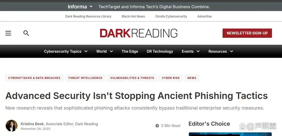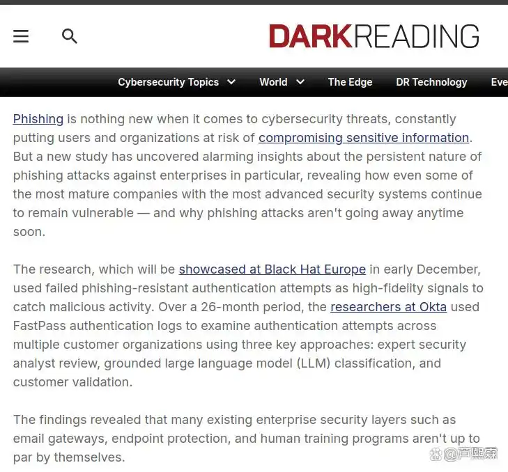 网络钓鱼长期以来被视为入门级网络攻击手段,其典型特征是批量发送语法粗糙、模板化的欺诈邮件,依赖用户疏忽而非技术精巧。然而,这一认知正被迅速颠覆。根据Dark Reading 2025年的深度调查,现代钓鱼攻击已呈现出显著的“专业化”“情境化”与“自动化”趋势。攻击者不再满足于窃取个人账户,而是将目标锁定为企业高管、财务人员与IT管理员,旨在获取高权限凭证、触发资金转账或部署勒索软件。此类攻击通常以数周甚至数月的前期侦察为前提,利用LinkedIn、公司官网、SEC filings等公开信息构建目标画像,进而设计出在语言风格、业务逻辑与格式规范上均高度仿真的钓鱼内容。