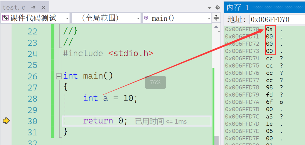 }上述的代码就是创建了整型变量a,内存中申请4个字节,⽤于存放整数10,其中每个字节都有地址,可利用调试的内存功能查看地址,如下图: